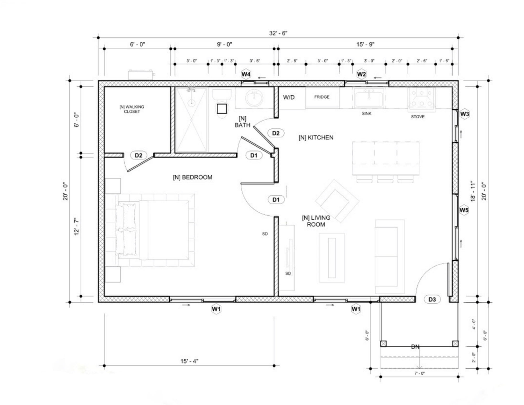 The design follows the trusted Wood Frame Prescriptive Provisions (WFPP), Type V construction. This method is one of the most common and builder-friendly options used locally. Designed with owner-builders in mind, this ADU is practical, affordable, and simple to build. The plan package includes architectural, structural, and basic MEP plans, giving you what you need to move smoothly through permitting and into construction.